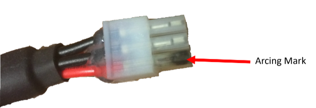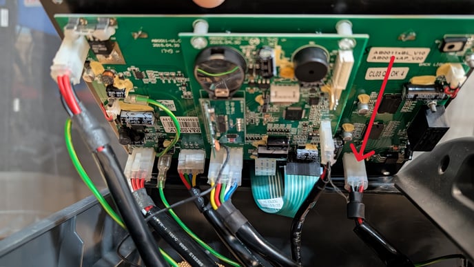 - Débranchez la prise à 6 broches alimentant les moteurs. Inspectez le connecteur pour détecter tout dommage ou trace d’arc électrique noir. Le câble à 6 broches est indiqué par la flèche rouge sur l’image ci-dessous. En cas de trace d’arc électrique noir, le câble à 6 broches et éventuellement la console devront être remplacés.