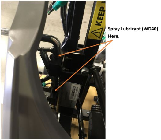 - Lubrification du bras oscillant – Si vous entendez le moteur tourner et remarquez un léger jeu, comme indiqué à l’étape précédente, l’étape suivante consiste à lubrifier le bras oscillant. Nous recommandons l’utilisation d’un lubrifiant en aérosol comme le WD-40. Les deux points à lubrifier sont indiqués sur l’image ci-dessous.
